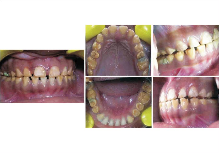 In case D, patient had loss of vertical dimension of occlusion and patient's inter-occlusal space was 4mm at rest. Therefore a treatment plan was evolved to increase the vertical dimension of occlusion by 4mm which was within the limit for the patient. [20] Full mouth restorations were planned with metal ceramic crowns. This treatment option of restoring vertical dimensions of occlusion for severe fluorosis patients requires careful investigations and preparation. This treatment option is limited to cases with severe fluorosis and loss of inter-occlusal space. Advantage of this procedure is that it is an extensive procedure by which the desired aesthetic results and functional efficiency is achieved. The main disadvantage is also its extensiveness in treatment procedure which requires extensive lab procedure and operator skill, knowledge.
